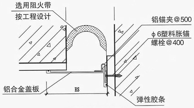 金属卡锁型内墙变形缝——由一块自由移动的中心板来实现变形,中心板压紧在两侧铝合金基架之间,在建筑物发生伸缩变形时能保持其水平状态。