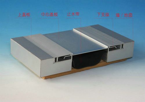 金属卡锁型内墙变形缝——由一块自由移动的中心板来实现变形,中心板压紧在两侧铝合金基架之间,在建筑物发生伸缩变形时能保持其水平状态。